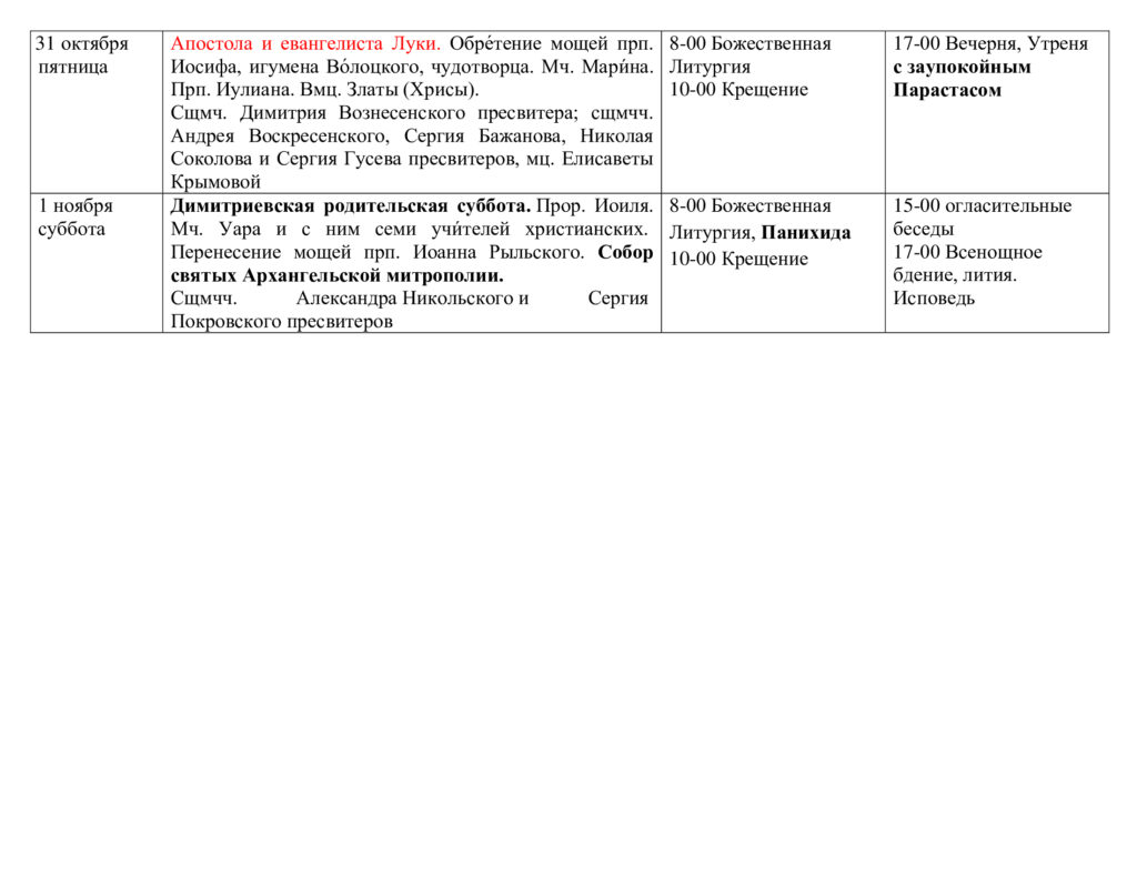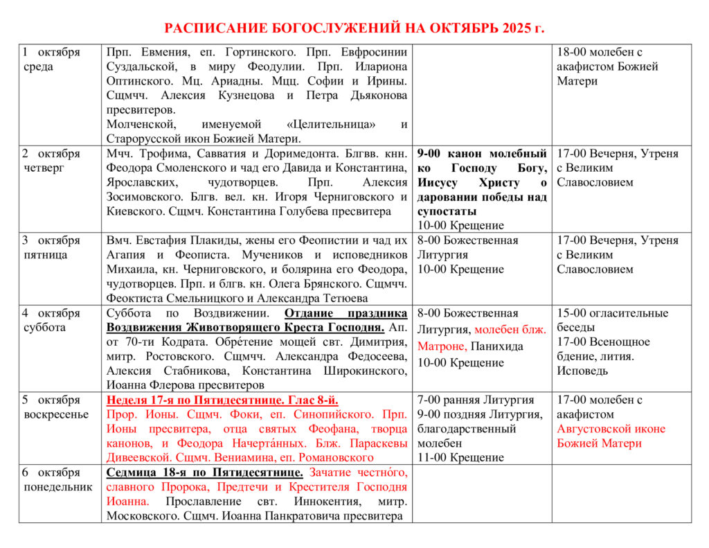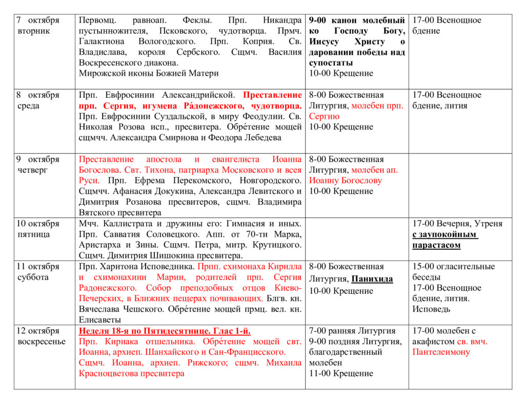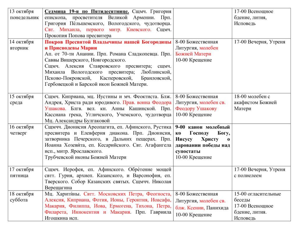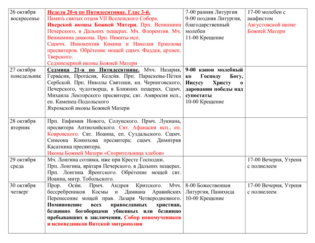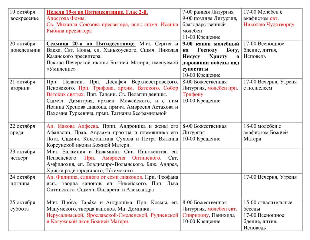Расписание богослужений